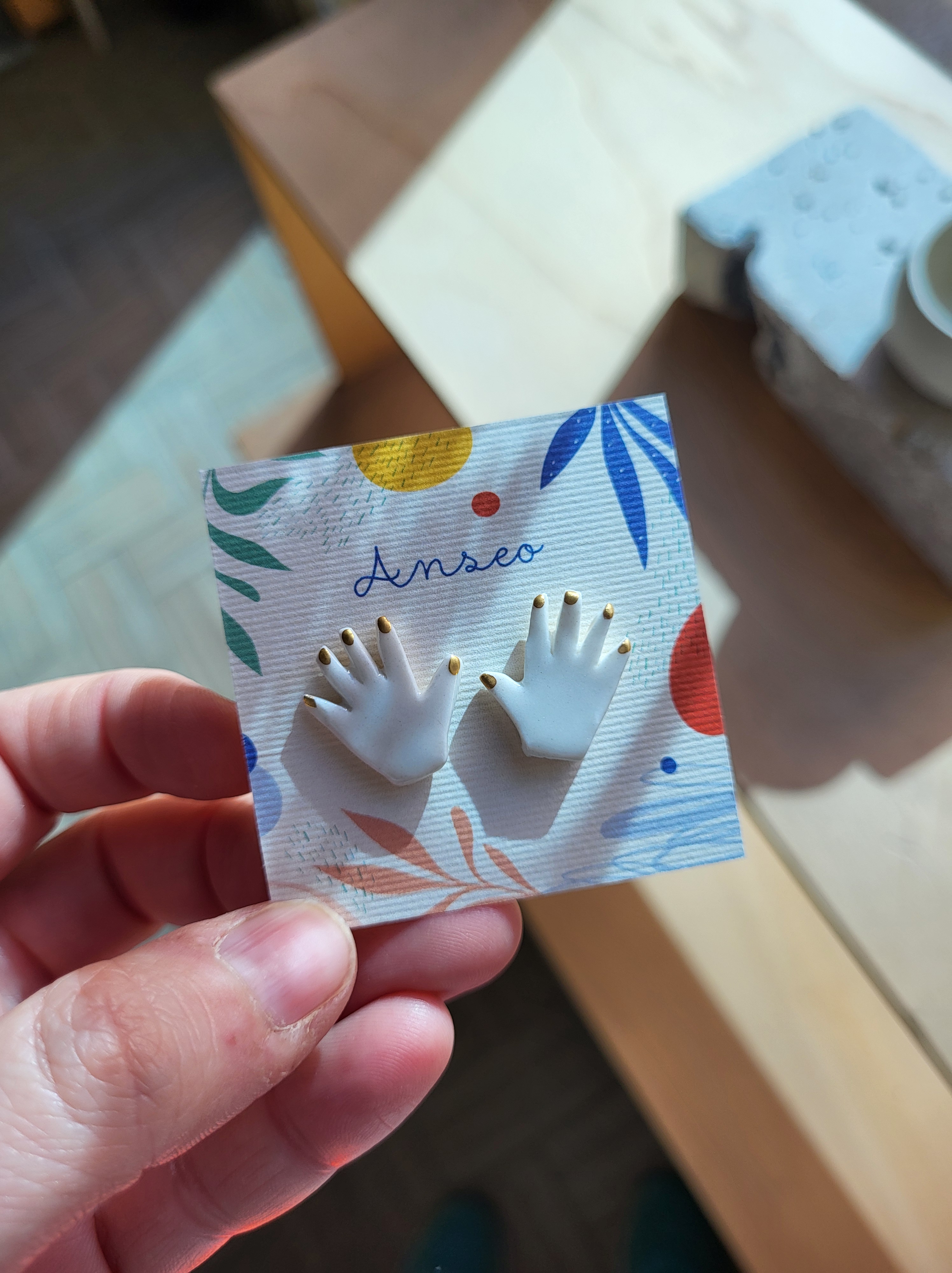 Orecchini in porcellana a forma di piccole mani con dettagli in lustro oro.